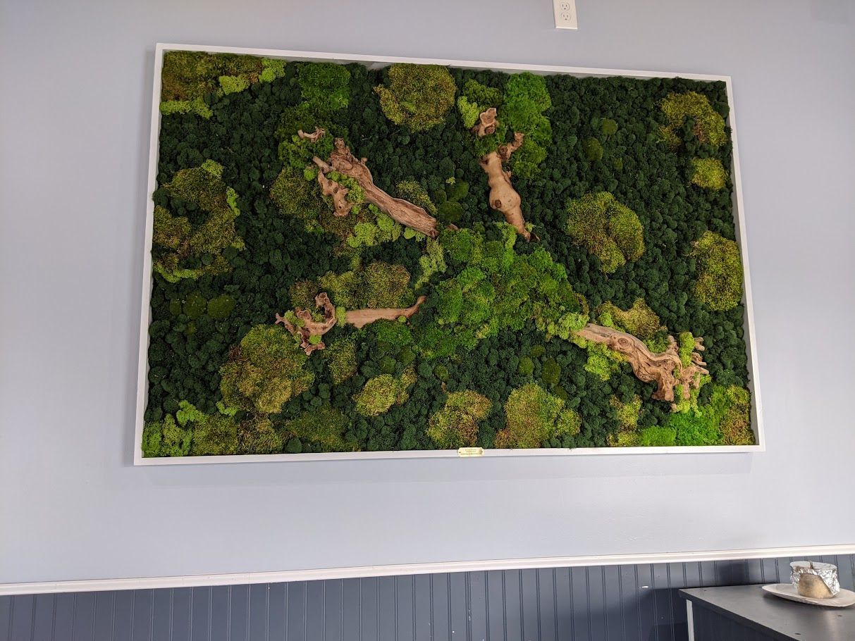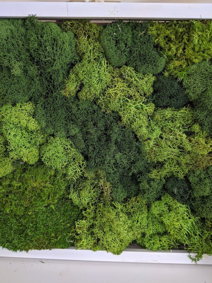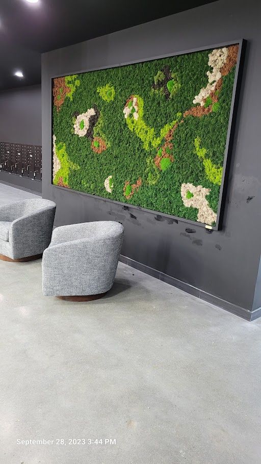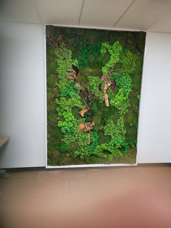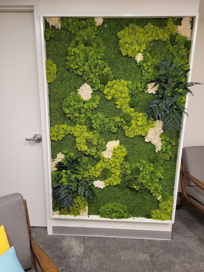 moss wall installation to match the aesthetic of the rest of your space. Whether you want a geometric design or want the shades of green to run wild, we can build the perfect framework for your preserved moss to rest in. Add one of our moss walls to your office and enjoy the natural beauty and various shades of green throughout your moss wall.
